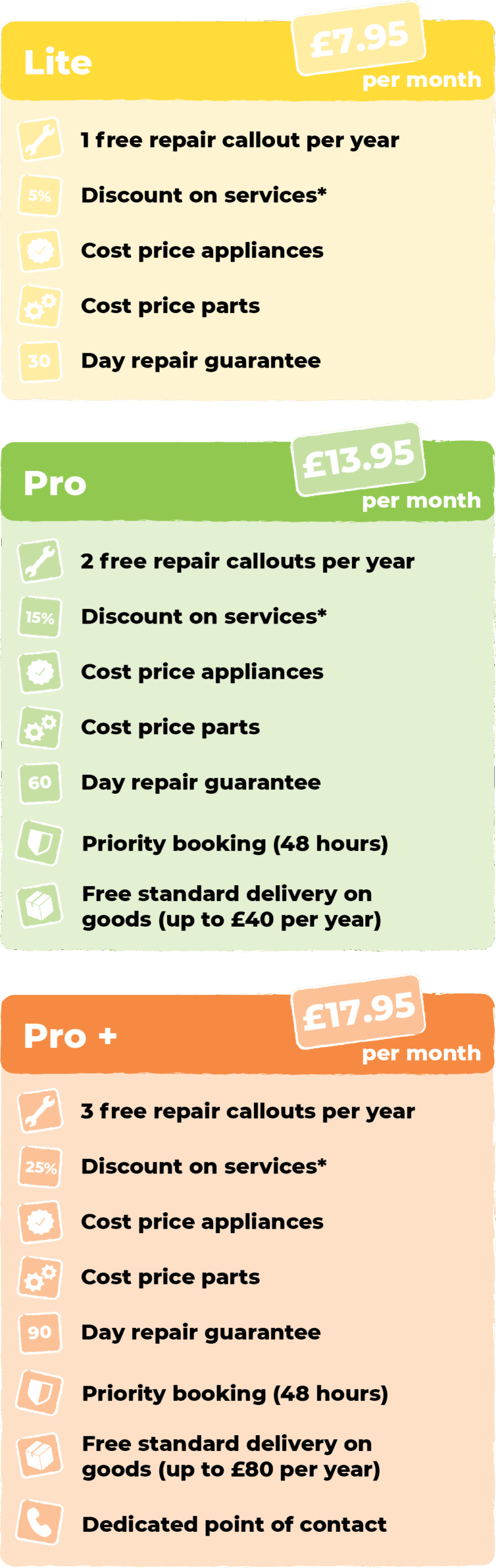 Enjoy peace of mind with exclusive member benefits designed to make appliance care convenient and affordable – including cost price parts, cost price appliances and discounts on services. Plus, up to 3 free repair callouts from our experienced appliance engineers, who bring decades of combined expertise to every job.